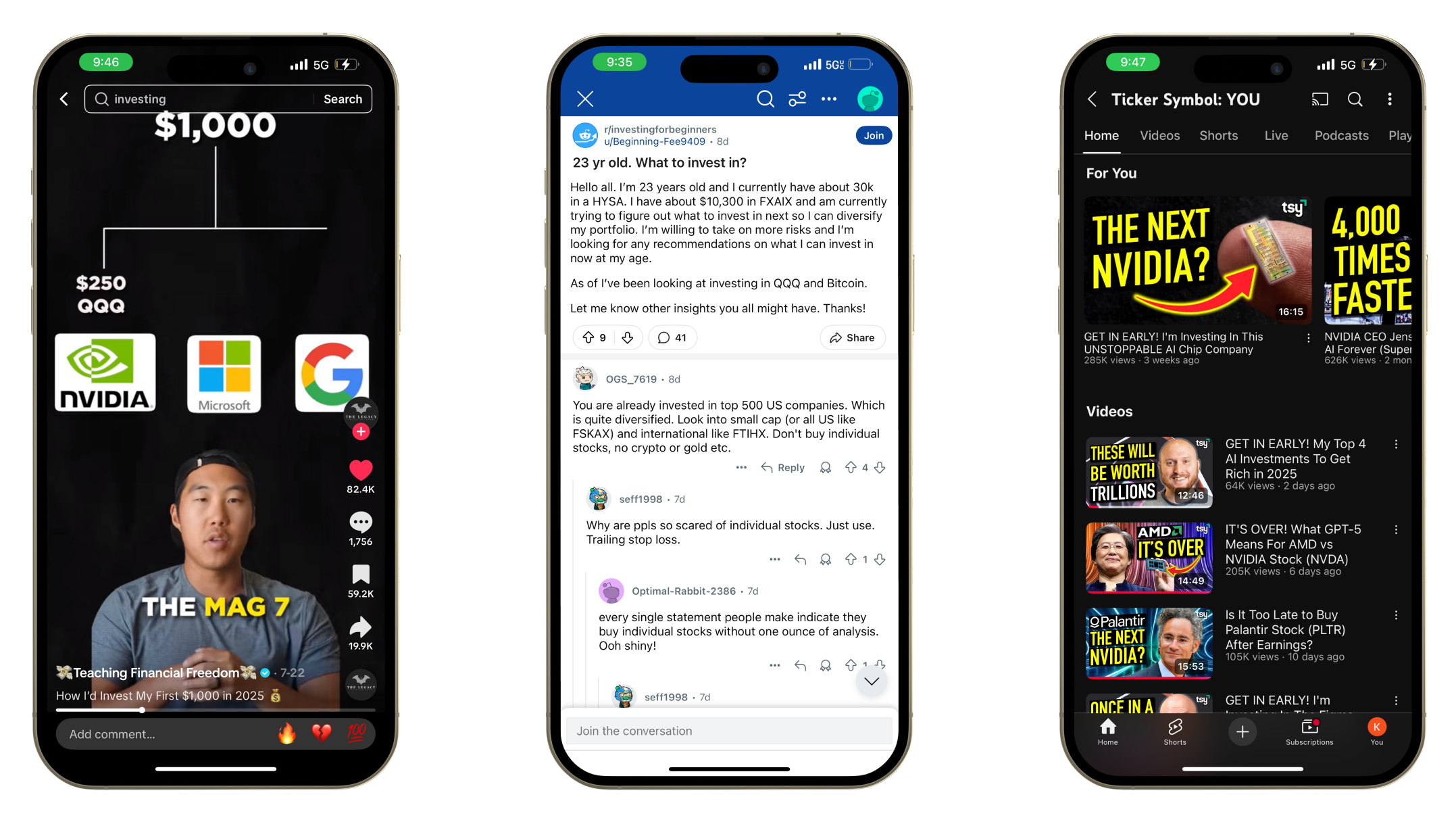 New investors told us they often check TikTok, Youtube, and Reddit before making decisions, because “investing apps throw a lot of stocks at you without context.”
