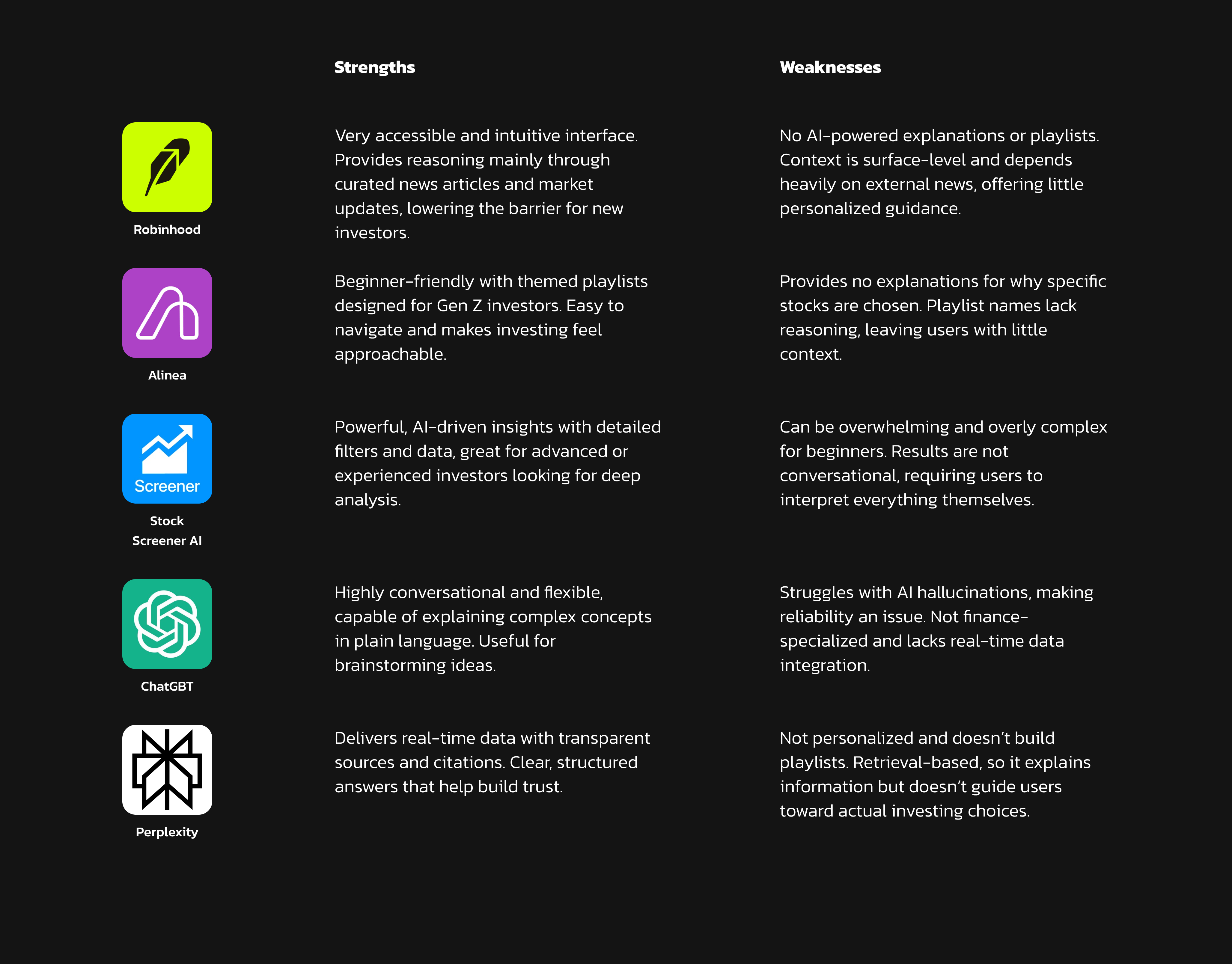 Benchmarked competitors like Robinhood, Alinea, Stock Screener, ChatGPT, and Perplexity. Each had strengths but also key gaps.