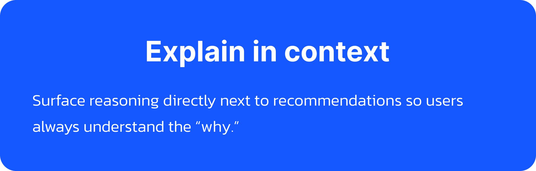 1. Trust through transparency — Users won’t act on AI suggestions unless they understand the “why” behind them. Explanations needed to be short, clear, and tied to real sources.