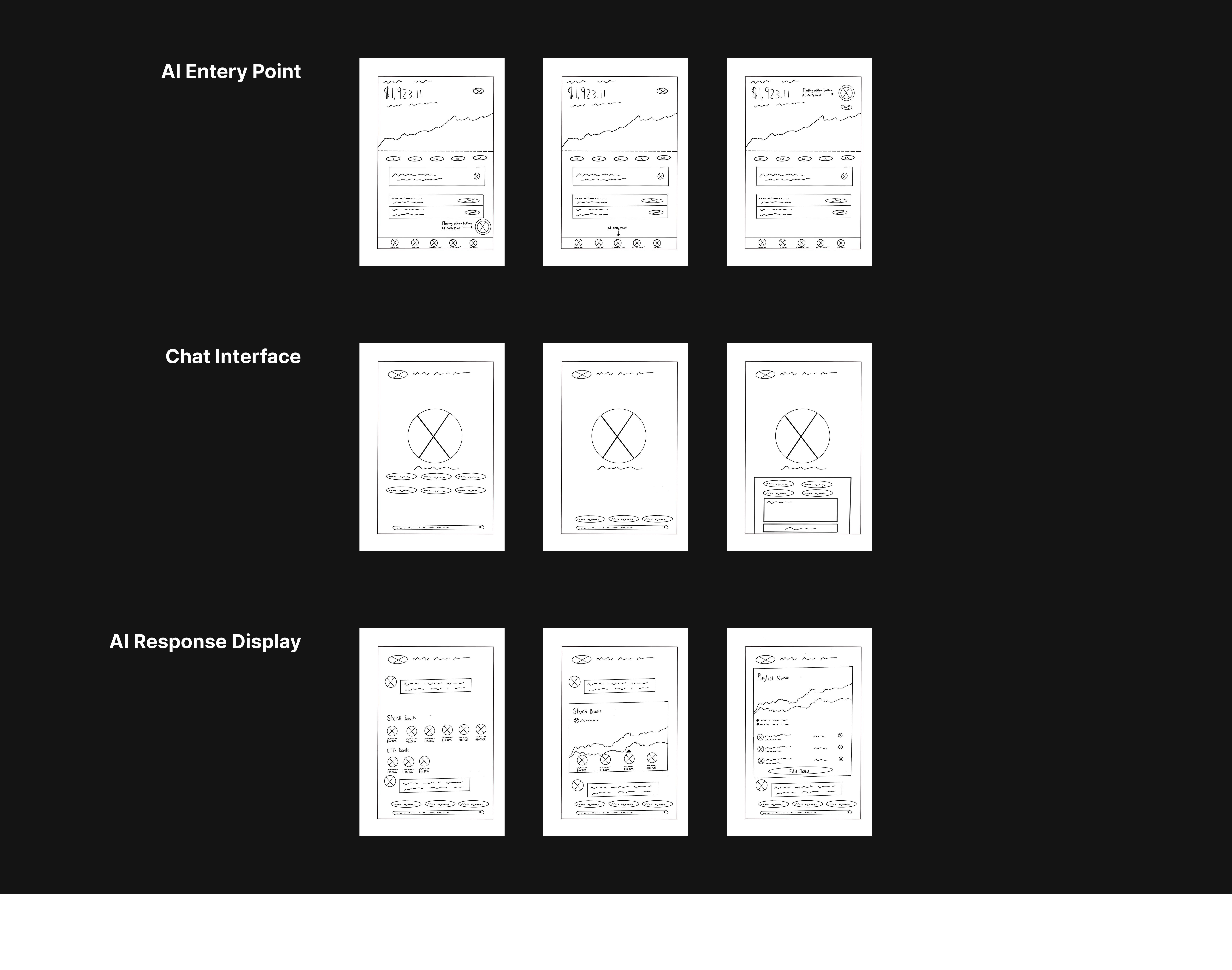 After finalizing the flows, I translated them into low-fidelity sketches to explore the core interactions. These sketches gave shape to the experience and helped the team visualize how the AI would show up inside the app.
