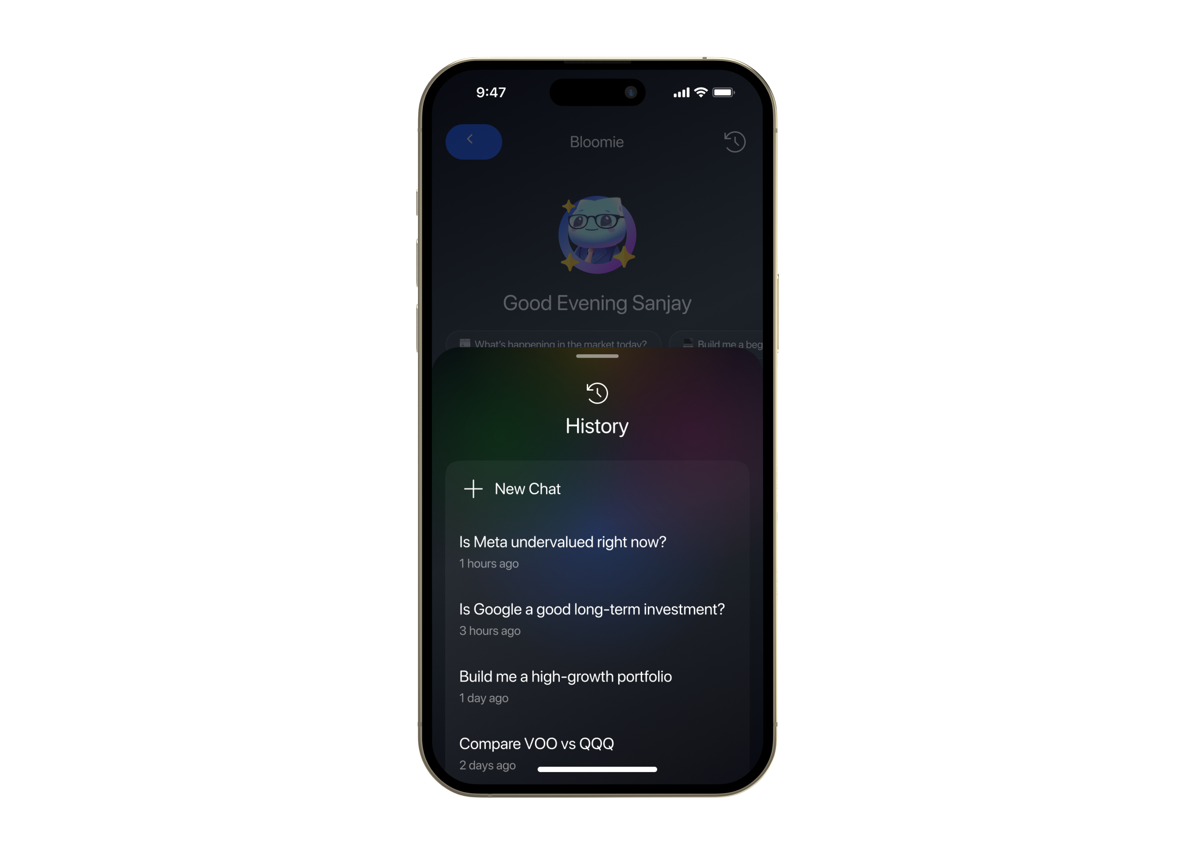 Bloomie is an AI research assistant designed to help users make sense of stocks, market signals, and investing ideas as they explore them. Instead of pushing recommendations, it adds context at the right moments, helping users move forward without overwhelming them or taking control away from them.