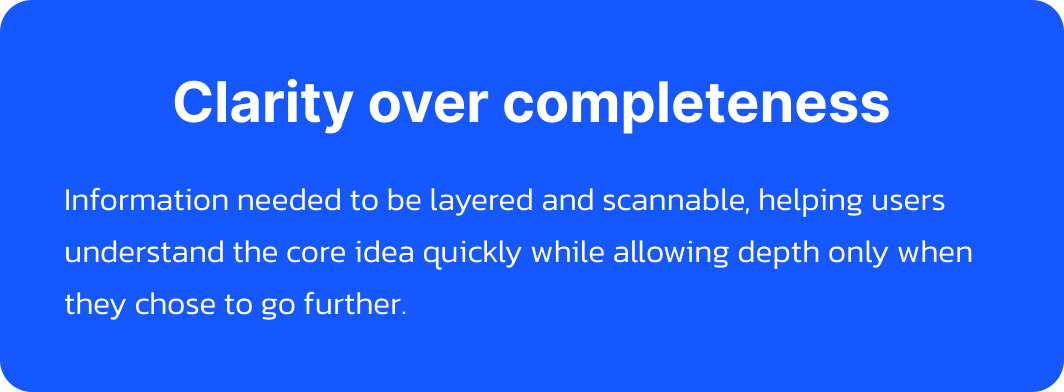When users tried AI tools, they disengaged quickly if responses felt generic, overly long, or disconnected from what they were actually looking at in the app. At the same time, they were clear about one thing. They didn’t want an AI that made decisions for them. They wanted help thinking, not instructions.