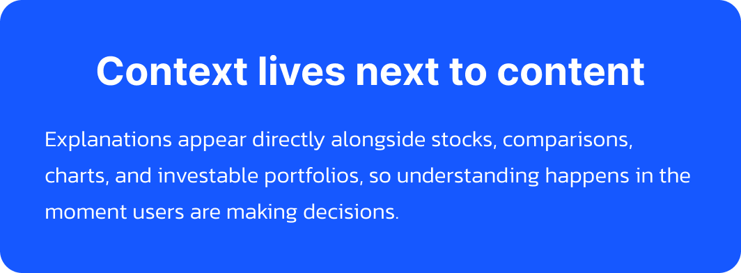 The issue isn’t a lack of information. It’s the gap between seeing options and understanding them. Users are shown stocks, cryptocurrencies, and ETFs (exchange-traded funds), but rarely understand why certain companies are grouped together, which signals are worth paying attention to, or how research should translate into an actual decision.