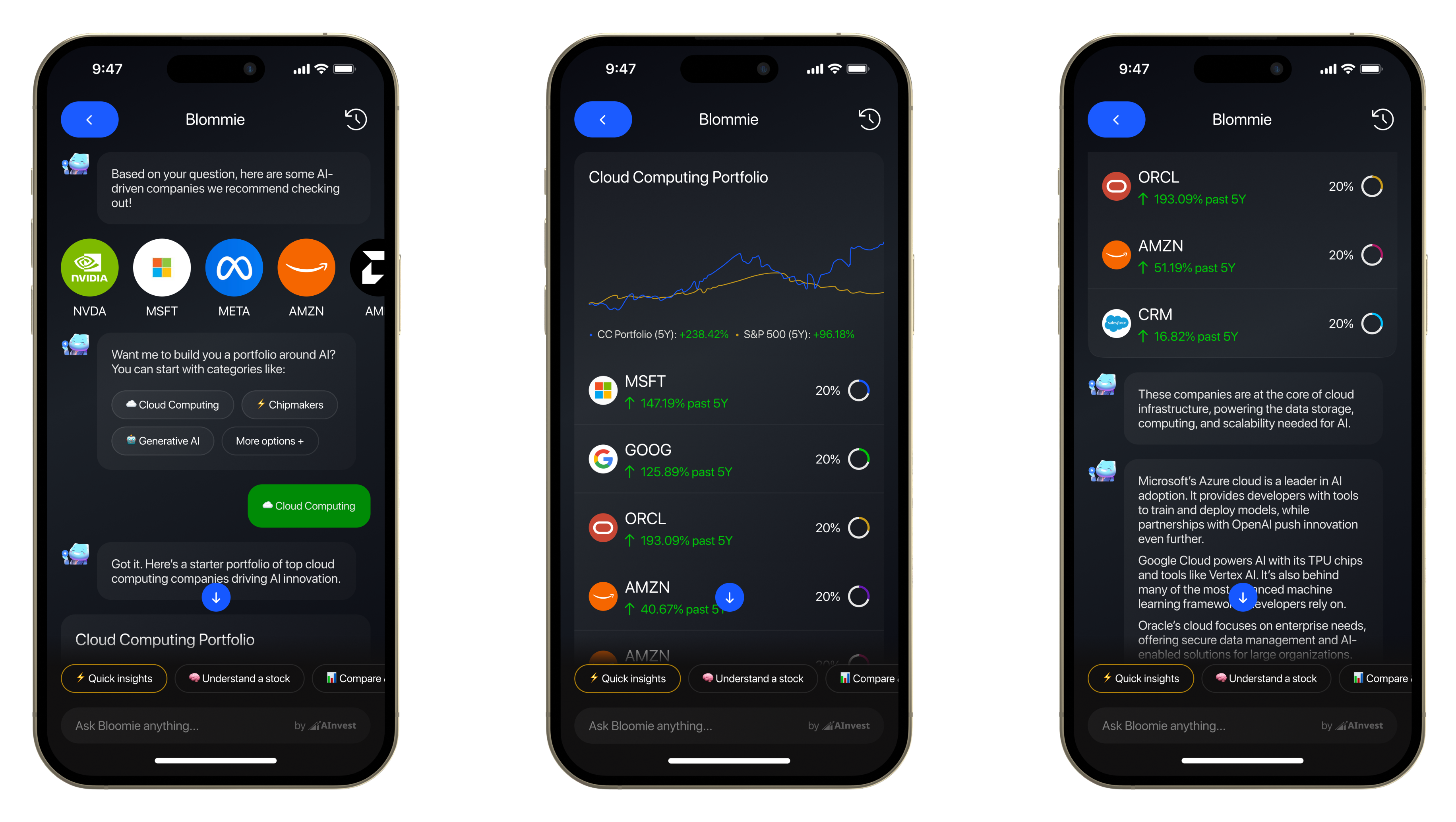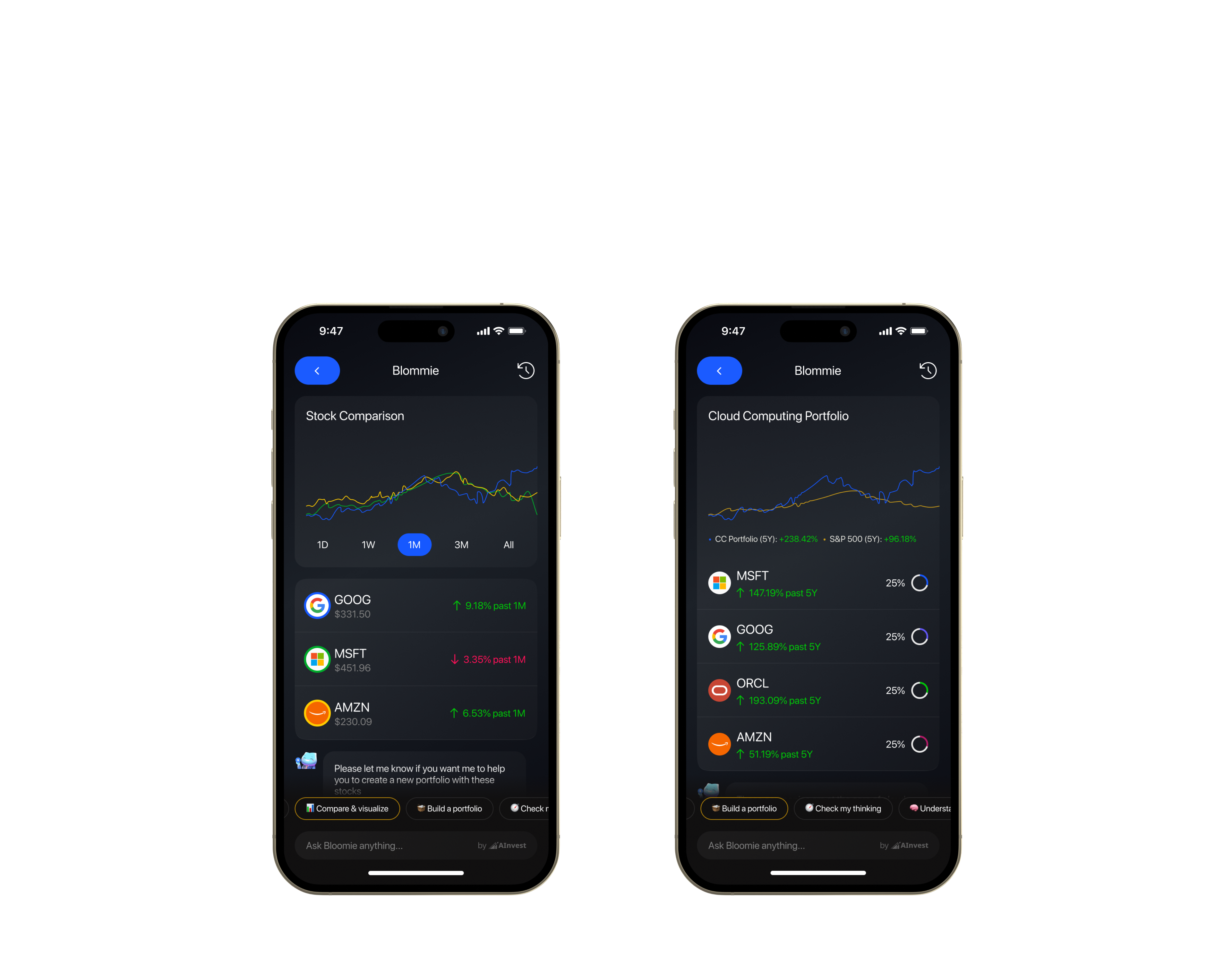 In practice, Bloomie behaved differently depending on context. Research-focused interactions prioritized explanation and sources. Comparison-driven interactions emphasized stock performance, trends, and visual graph comparisons. Portfolio-building interactions focused on tradeoffs and composition, while exploratory interactions stayed lightweight and open-ended.